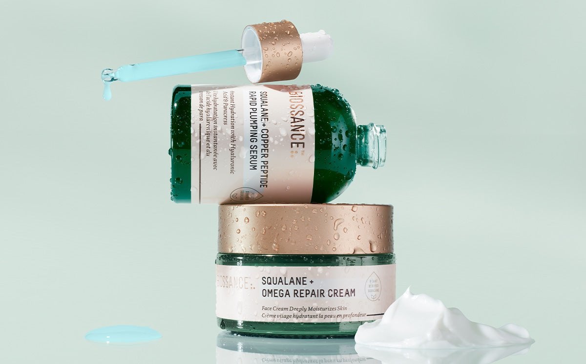 If you’re looking to plump fine lines and wrinkles….Choose our Squalane + Copper Peptide Rapid Plumping Serum. Our powerful blend of copper peptides, hyaluronic acid, and sugarcane-based squalane work together to target signs of aging, instantly hydrating and plumping wrinkles with continued improvement over time.