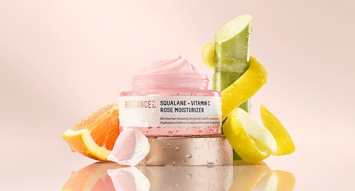 Our new Squalane + Vitamin C Rose Moisturizer includes a breakthrough brightener that gets its powerful potency through the fermentation process.“The fermented lemon peel in our new Squalane + Vitamin C Rose Moisturizer is a potent ingredient that’s been proven to have stronger brightening capabilities than leading chemical brighteners on the market,” says Celeste.Fermented lemon peel provides antioxidant support to the skin, helping to improve the look of uneven skin tone and  prevent signs of discoloration. In consumer surveys, 100% of participants agreed that their skin looked instantly brighter and more radiant upon application. Shop Squalane + Vitamin C Rose Moisturizer